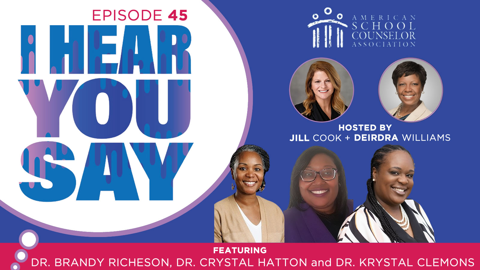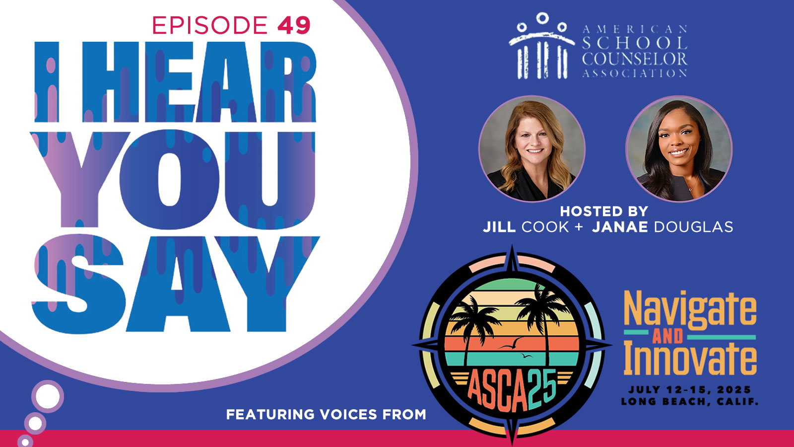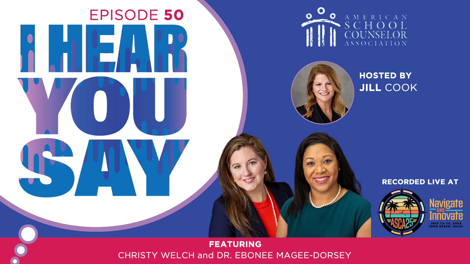 Join hosts Jill Cook, ASCA executive director, and Janae Douglas, ASCA education and training coordinator, for conversations with school counselors and education leaders. Whether you’re looking for expert advice, inspiring stories or updates on best practices, I Hear You Say provides a trusted space for learning and connection within the school counseling community.