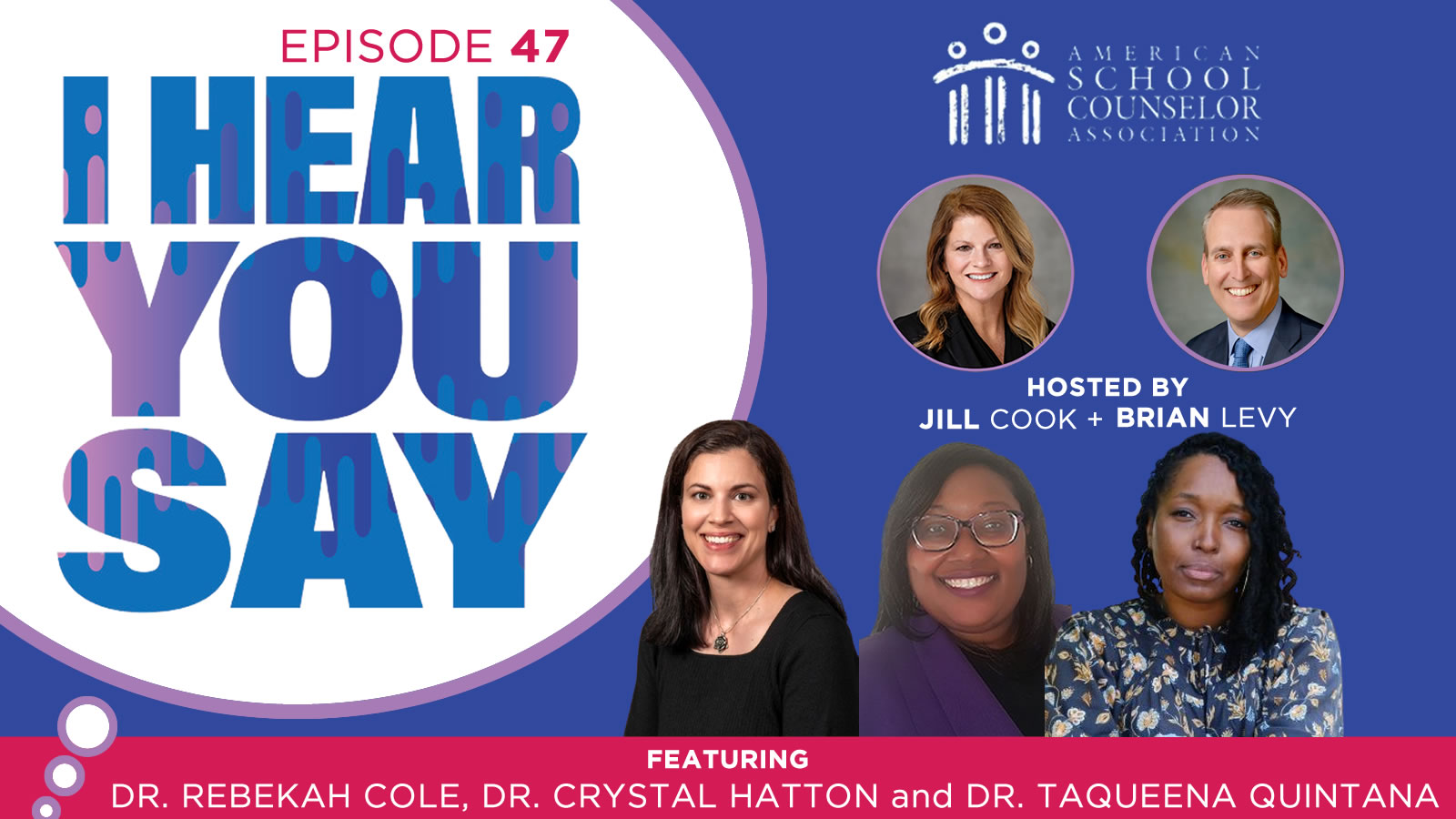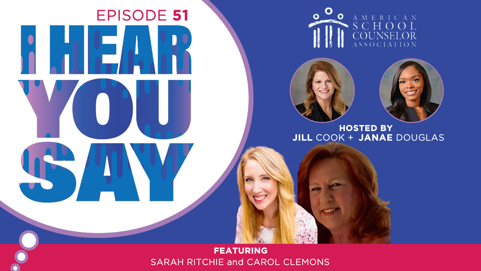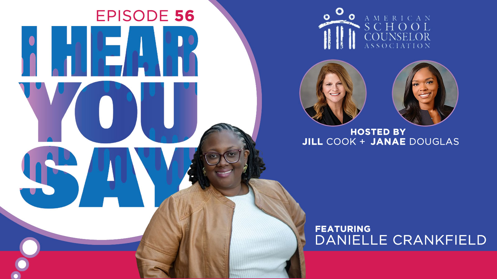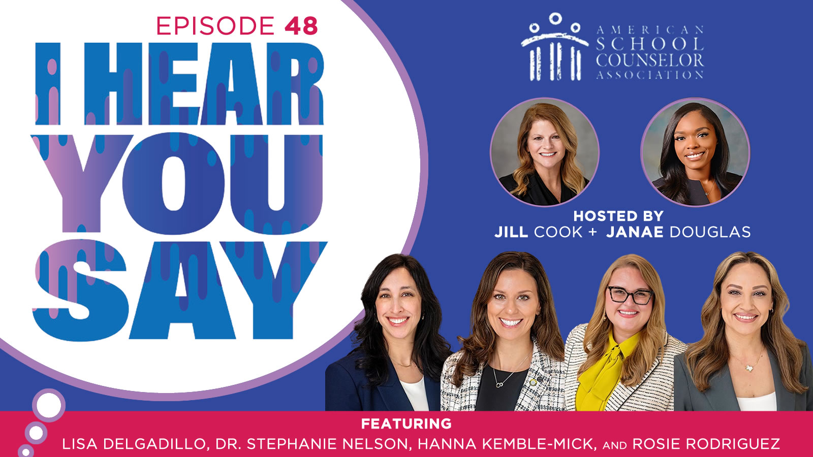 Join hosts Jill Cook, ASCA executive director, and Janae Douglas, ASCA education and training coordinator, for conversations with school counselors and education leaders. Whether you’re looking for expert advice, inspiring stories or updates on best practices, I Hear You Say provides a trusted space for learning and connection within the school counseling community.